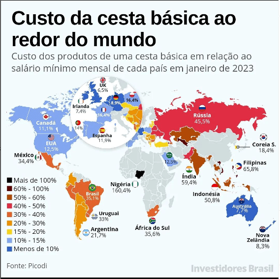 Outra pesquisa exposta no Instagram Investidores Brasil, apresenta a realidade do custo da cesta básica ao redor do mundo.
